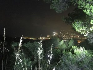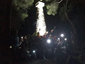 Vàrem sortir del Centre i vàrem pujar pel Camí de la Fita i desviant-nos pel recorregut de la Rock Trail fins el Coll de la Fita, vàrem continuar fins el Gafarró fent parades per contemplar Sitges de nit. Allà vàrem menjar un entrepà mentre admiràvem el nostre poble de nit. Després vam continuar per la pista principal fins pujar a la Creu de Sant Isidre on amb uns potents frontals la vam il.luminar com si fos de dia, ens vàrem fer les fotos de rigor i varem baixar per Quint Mar tot tornant a quedar embadalits al veure la bellesa de la Blanca Subur des d’allà a dalt.