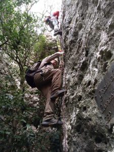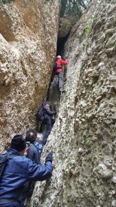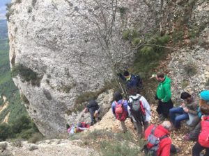 Comandats pels companys que ja havien realitzat la sortida previament, vam sortir en direcció els nostres diversos objectius : el grau del Carrasclet, equipat amb 2 trams d’escales i graons de ferro, de pujada camí de la Serra Major i cap a la Roca Corbatera, Punt culminant de l’excursió. La part de dalt del Massís amb força vent, pero amb un dia de gran visibiliat tot al nostre voltant. Per la tornada vam baixar a la banda sud, arrecerats del vent, aquí tot desfent camí per sota la carena vam poder entrar a la cova Santa, passar per la roca dels Dotze i es baixa pel Grau del Carbassal, que també es fa mitjançant graons de ferro, escales i concentració.